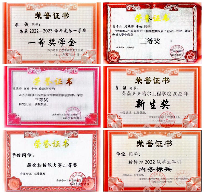 李俊一入学便表现突出,他在军训期间被评为“2022级学生内务标兵”,因在班级各方面表现优异,获得“2022年新生奖”“2022-2023学年度第一学期一等奖学金”。
