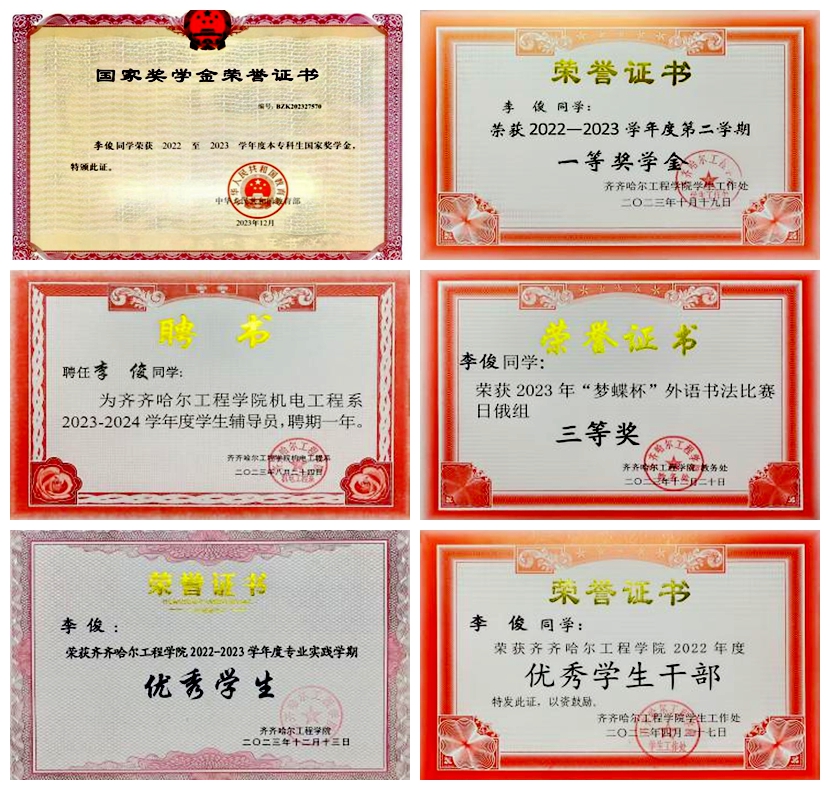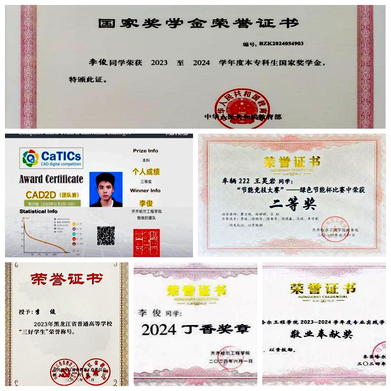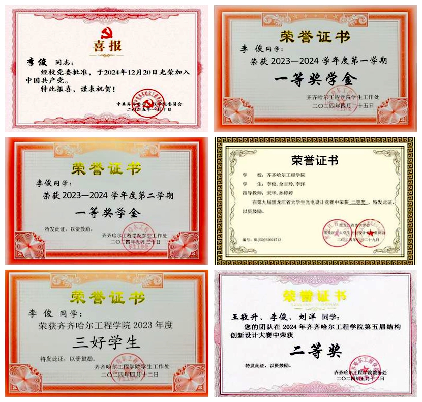 李俊在大二学年时,深知参加竞赛的重要性,他积极报名参加各类比赛,荣获“第29届CaTICs CAD2D(团队赛)国家级”三等奖、“第九届黑龙江省大学生光电设计竞赛”二等奖、“2024年bevictor伟德国际1946第五届结构创新大赛”二等奖、“节能竞技大赛-绿色节能杯比赛”二等奖。李俊在学习上成绩优秀,获得“bevictor伟德国际19462023年度三好学生”“2024丁香奖”“2023年黑龙江省普通高等学校三好学生”,并在专业实践学期中,获得“2023-2024学年度专业实践学期敬业奉献奖”荣誉称号。同时,荣获“2023-2024学年度第一学期一等奖学金”“2023-2024学年度第二学期一等奖学金”“2023-2024学年度本专科生国家奖学金”等多项荣誉,并于2024年12月20日光荣加入中国共产党。