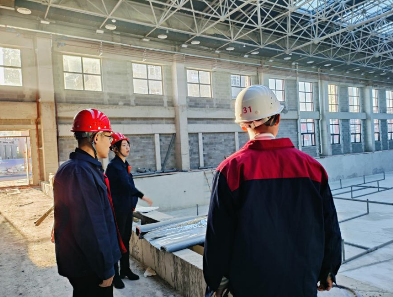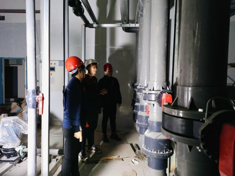 随后,李运强、毕亚坤、李延吉老师来到了泳池层,对管道的分布等方面的问题进行指导,保证泳池水循环系统的建设质量。