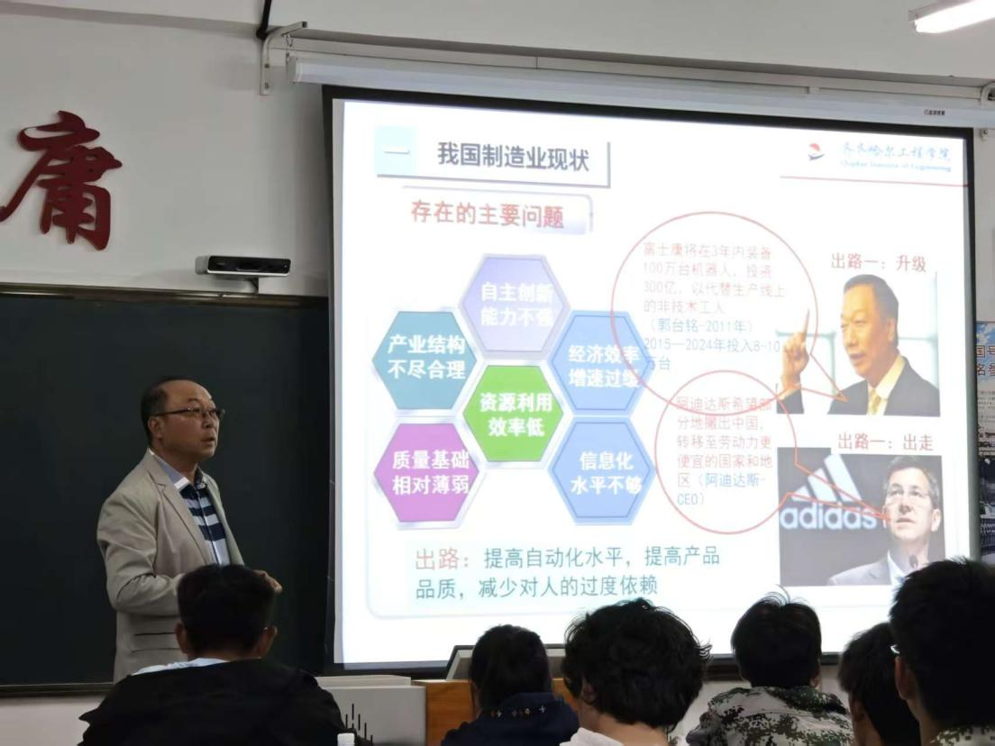 讲座中,刘义翔围绕四大核心板块展开详细讲解。首先,他结合走访调研数据,分析我国制造业现状,指出当前存在制造产业结构不合理、劳动力成本持续增长、“人工荒”现象凸显、低端劳动密集型企业占比高等四大困境,并深入解读这些问题的成因与破解“出路”;然后,他系统梳理工业机器人的发展历程与当前现状,预判未来技术演进方向,让学生清晰把握行业动态;随后,他聚焦工业机器人在食品包装领域的实际应用,通过案例展示技术落地场景与价值;最后,他介绍了哈尔滨商业大学在分拣机器人研发方面的成果,激发学生的专业探索兴趣。整场讲座内容详实、案例鲜活,为学生搭建起理论与行业实践对接的桥梁。