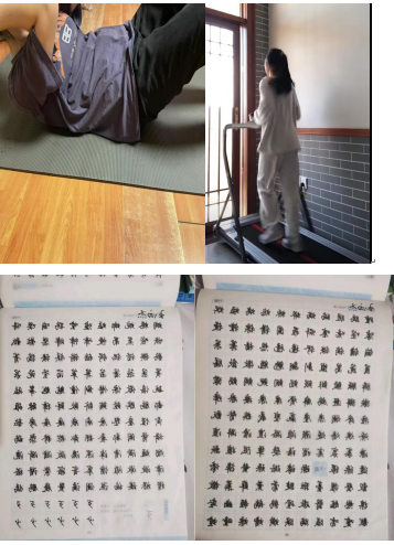 为在假期提高自身能力并且积极响应第四学期实践活动,我们290组王雨杰、梁畅、杨得青、纪海洋四人进行了书法临摹和锻炼活动。