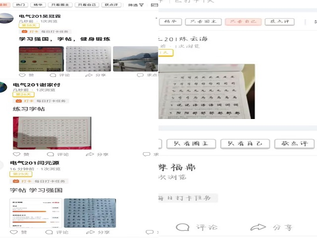 在第六周期间,机电系8组电气201班的同学认真完成了每日字帖、学习强国打卡、健身锻炼和影视赏析任务。我们小组成员积极完成第四学期的任务,在实习期间,不断提升自己。