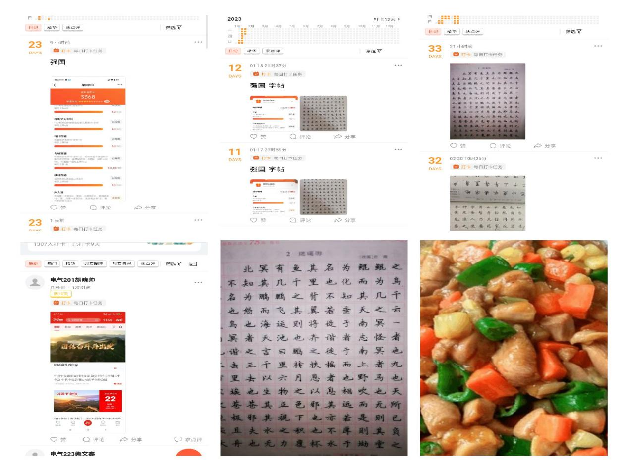 第四学期第六周从2月20号开始到2月26日结束,机电系15组的同学完成了每日的字帖、强国打卡、居家锻炼以及感恩实践任务。