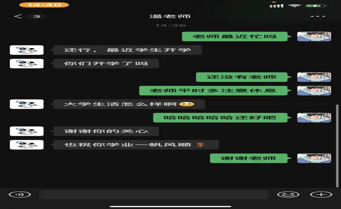 在2023年2月16日,机电系241组栾春浩通过线上的方式对母校和老师进行问候和关心,并了解母校现在的情况,以及老师对我的希望和嘱咐。