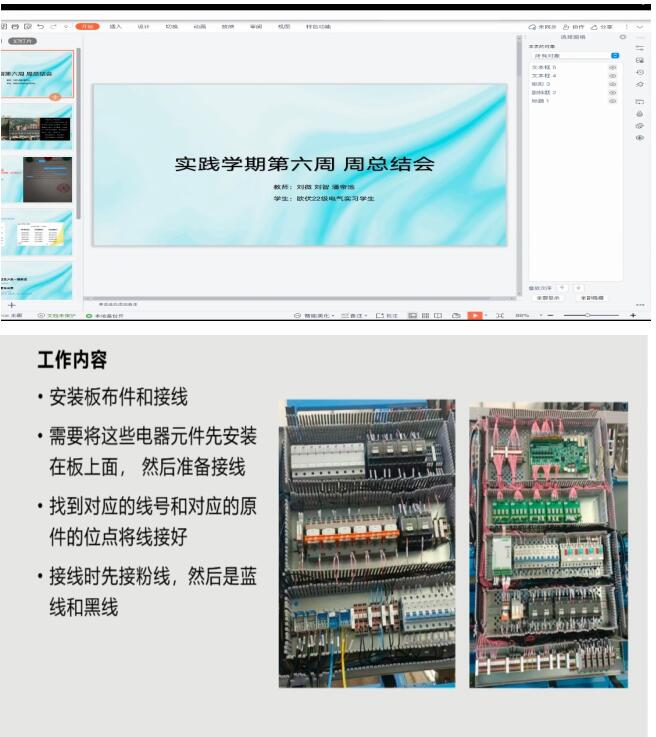 作为大一的学生,第一次参加实践学期,潘帝池老师经常强调安全,工作时需要穿防砸鞋,长裤等人身安全永远是第一位的。会议中,由一个小组代表为我们讲解他们的工作内容,工作流程,注意事项,典型案例,以及实习感受与收获。同学们在实习中学习到了电气相关的专业知识,进一步领略了学校提出的五种能力的内涵,并且努力在实习中实践五种能力。