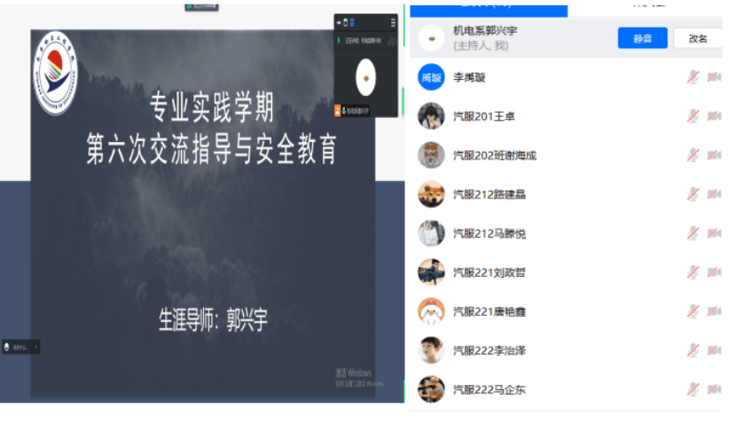 在7月30日下午,生涯导师郭兴宇老师利用腾讯会议组织同学召开了专业实践学期第六周交流指导与安全教育。