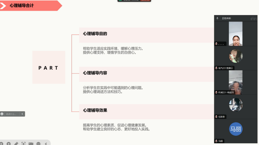 课程内容涵盖了日常生活中的多个方面,以及针对实践活动中可能遇到的心理问题知识,通过图文并茂的讲解和互动问答环节,学生们积极参与,收获满满。实践学期不仅是知识与技能的提升期,也是心理素质的考验期。因此老师通过此次安全教育,帮助学生们调整心态、缓解压力,老师通过分享心理学知识、开展团体辅导等方式,引导学生们正确认识自我、管理情绪、增强抗压能力,为实践学期的顺利进行提供了有力保障。