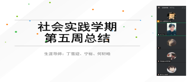 本周,生涯导师何轩皓,宁裕,丁雪迎为学生们开展了一场别开生面的第四周总结会议。会上,导师们首先回顾了过去一个月里学生们在社会实践中的点点滴滴,对学生的辛勤付出和取得的成果给予了高度评价。