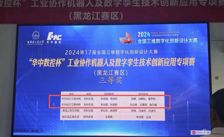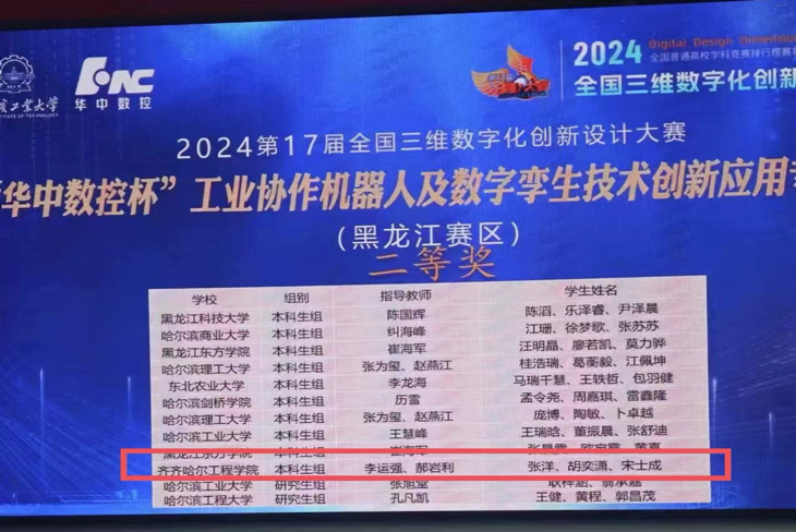 7月13日,第17届全国三维数字化创新设计大赛“华中数控杯”黑龙江赛区决赛结果公布:我校机电工程系学生斩获二等奖1项,三等奖2项。由机械设计制造及其自动化专业学生机械213张洋、机械221胡亦潇、机械211宋士成组成的队伍荣获二等奖;机械222王重阳、机械222高月童、机械221刘正杨组成的队伍荣获三等奖;机械212刘展、机械222刘麟松、机械221董思彤组成的队伍荣获三等奖。